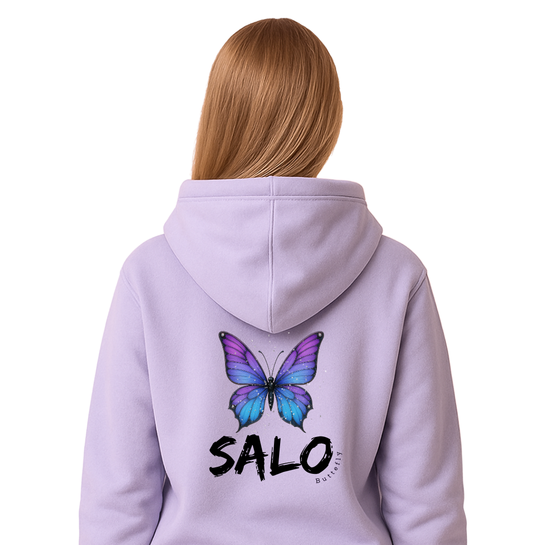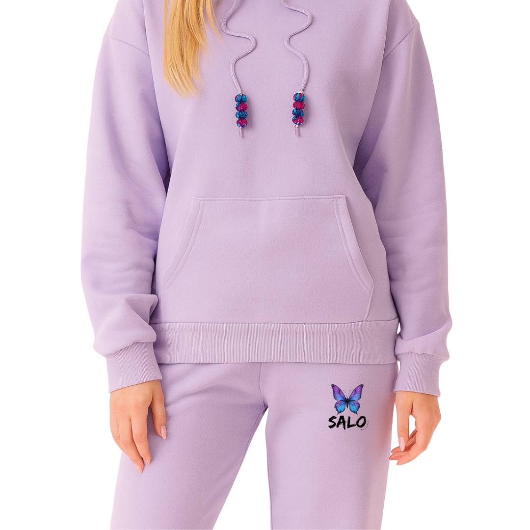 En la parte trasera, una mariposa violeta y azul con detalles de purpurina resplandece como símbolo de transformación y libertad, acompañada del sello inconfundible de SALO Butterfly. El pantalón, a juego, lleva el mismo emblema bordado, creando un conjunto armonioso y lleno de energía positiva.