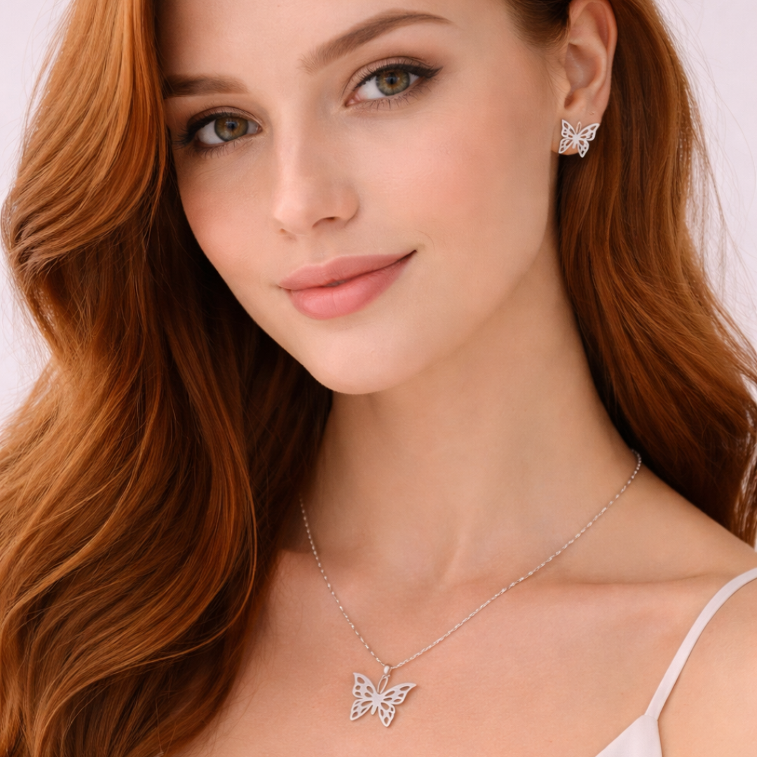 Este conjunto de mariposa, compuesto por un colgante y pendientes a juego, simboliza el poder de la metamorfosis personal.