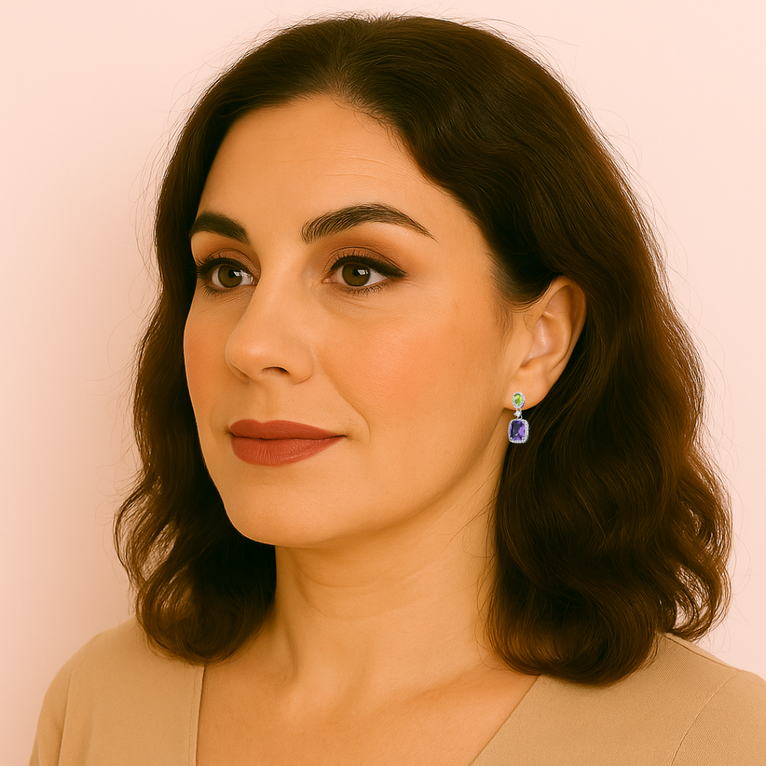 - Una piedra principal de corte cushion, en verde o violeta, que aporta profundidad y un destello vibrante en cada movimiento.
