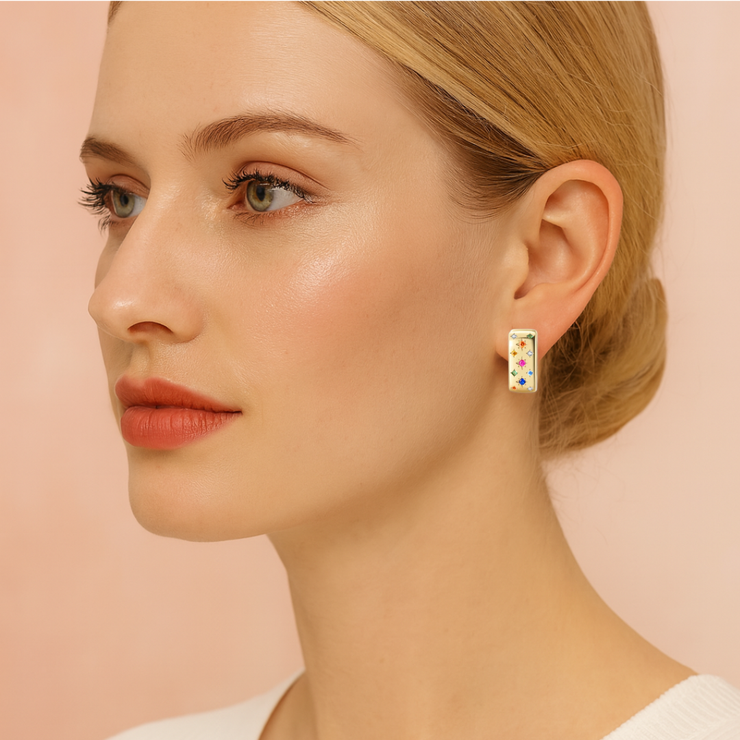 Estos pendientes de aro en Plata de Ley S925 con acabado dorado están decorados con pequeños símbolos de colores que recuerdan constelaciones, planetas y destellos. Su diseño original y vibrante es perfecto para añadir un toque de magia y color a tu día a día. Ligeros, cómodos y con mucha personalidad, son un homenaje a quienes llevan el universo por dentro.